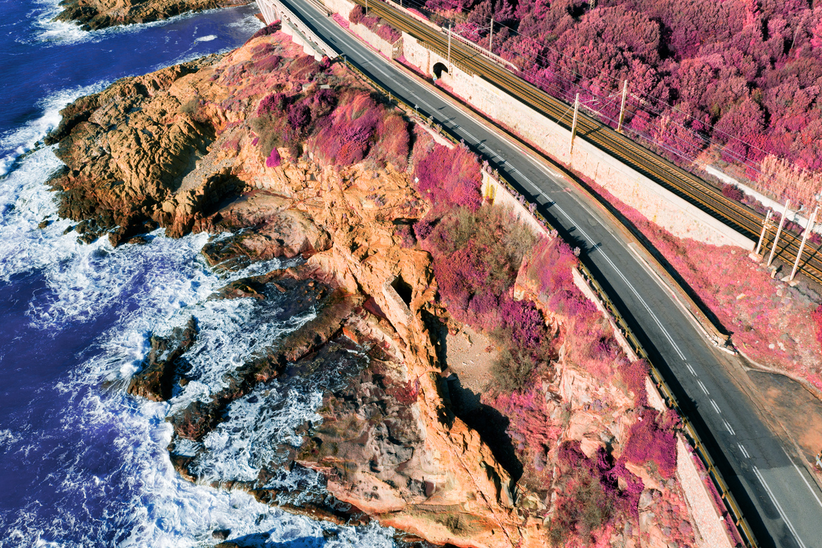 Frammenti di asfalto, visti dal drone, si immergono nell'invisibile luce dell'infrarosso attraversando eterei e surreali paesaggi, un mondo che vive accanto a noi ma che solo inconsapevolmente abitiamo.