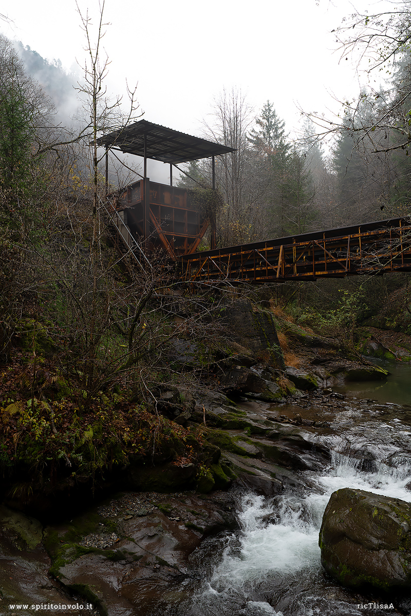 La nebbia che riempie la stretta vallata e la pioggia che cerca di trafiggerla creano una visione onirica e surreale, la strada, immersa nel foliage, appare a tratti e subito dopo si dissolve per emergere di nuovo ed è allora che alzando gli occhi mi appare come un magnifico etereo castello fiabesco, sono alla miniera Torgola.